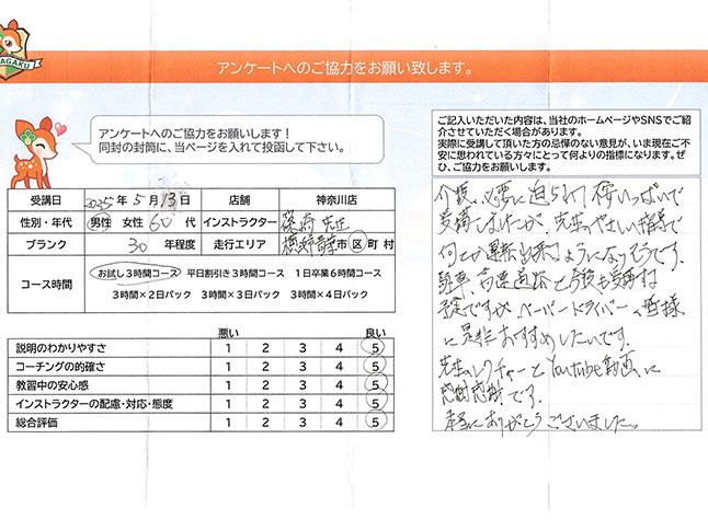 「介護で必要に迫られ、不安いっぱいで受講しましたが、先生のやさしい指導で何とか運転できるようになりそうです。